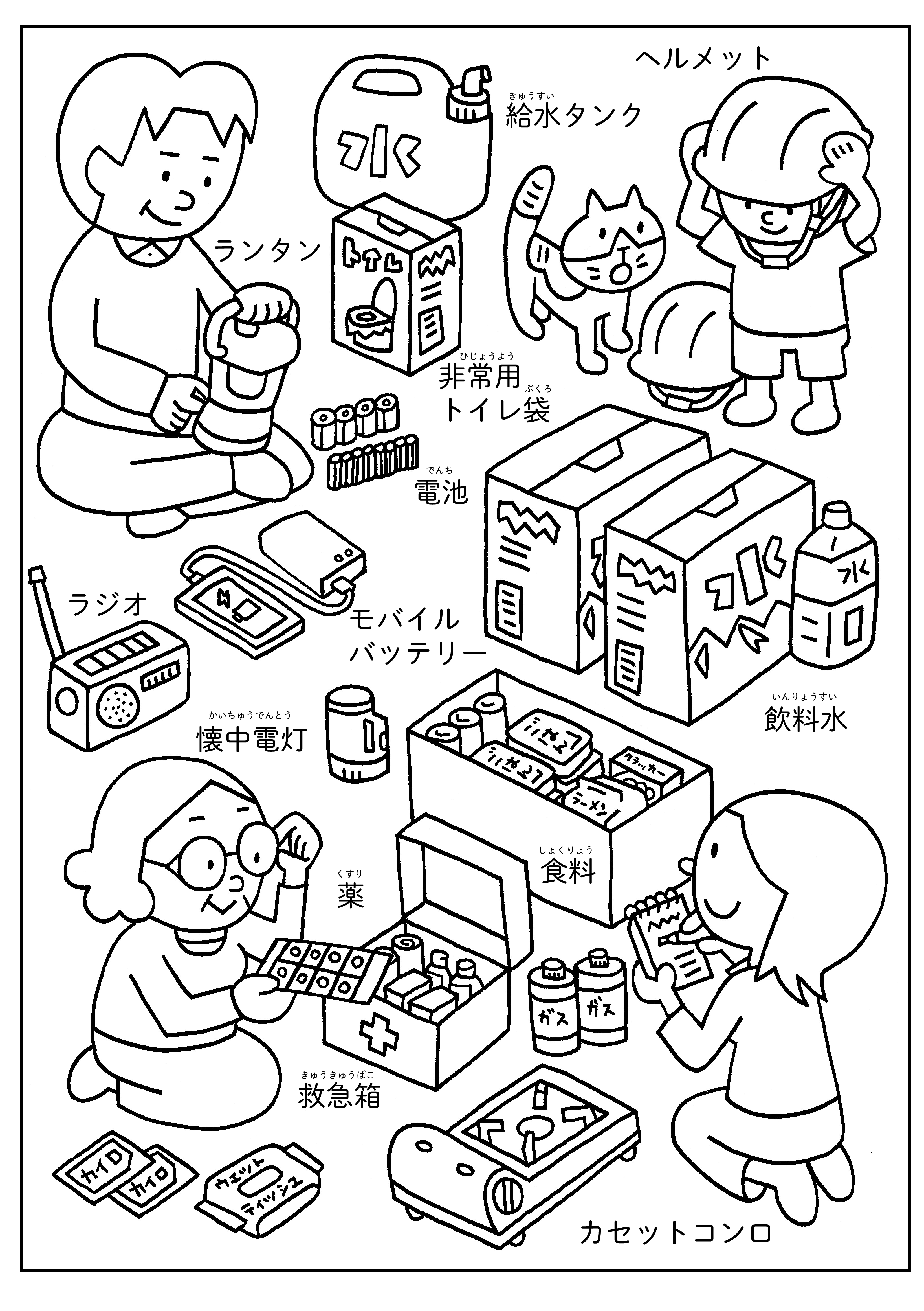 1 災害に備えよう! いざというときのために備えておいた方がいいものを題材にしたぬりえです。