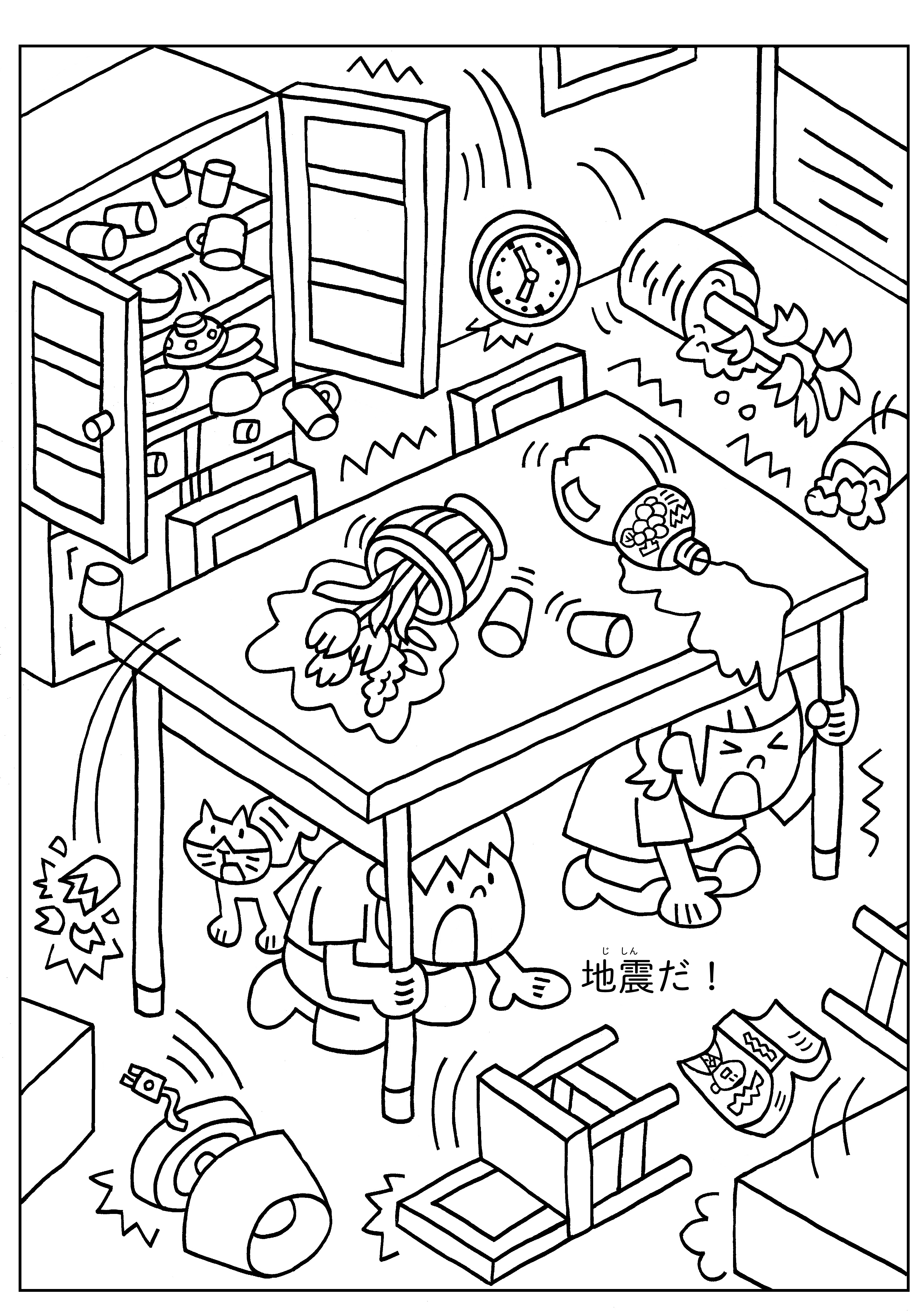 3 地震のときはどうする? 地震が起こって、机の下で身を守っている様子のぬりえです。